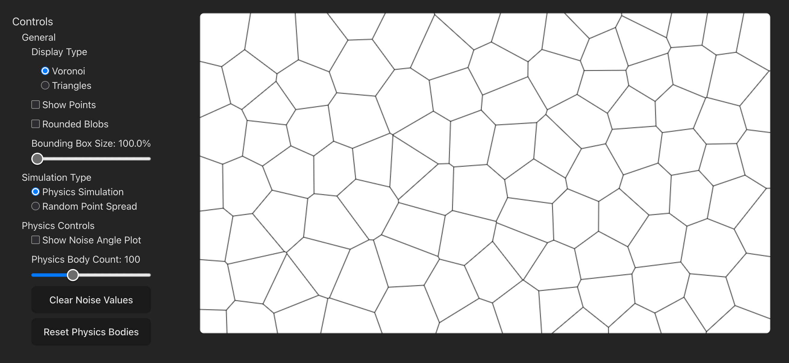 1/5/2024I spent about a week putting together this little demonstration of Voronoi Diagrams along with some kinematic simulations. I didn't really have a plan when starting this project, but it turned out to be pretty interesting. I probably won't come back to this, but time will tell.